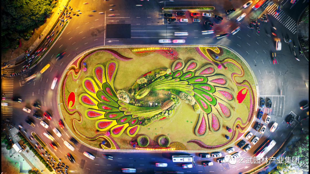 以“喜迎二十大,奮進(jìn)新征程”為設(shè)計主題;在保留孔雀主體綠雕的情況下,圍繞其四周采用繽紛的造型花柱、飄揚(yáng)的紅旗、科技感的“城市背景”及精致飄逸的植物花帶結(jié)合,演繹百年征程、筑夢未來。花帶造型內(nèi)含“2022”亮化展示,“城市背景”展現(xiàn)在飄揚(yáng)的紅旗上,表達(dá)南京人民喜迎黨的二十大勝利召開,也展現(xiàn)了在黨的堅(jiān)強(qiáng)領(lǐng)導(dǎo)下人民奮進(jìn)新征程,建功新時代的豪情和信心。